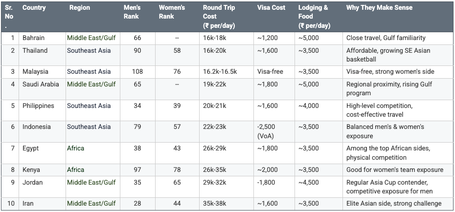 They are ranked above India in FIBA men’s or women’s rankings, ensuring the exposure is competitive and meaningful. (The only exception to this rule is Kenya, where both teams are ranked lower than India. That said, the country can still provide excellent exposure at least for the Indian women’s team.)