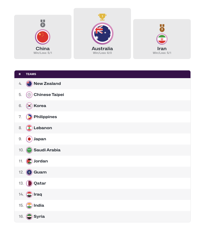 Meanwhile, India had a disappointing campaign, exiting the preliminary group phase with three straight losses. They finished 15th, above only Syria in the overall standings.