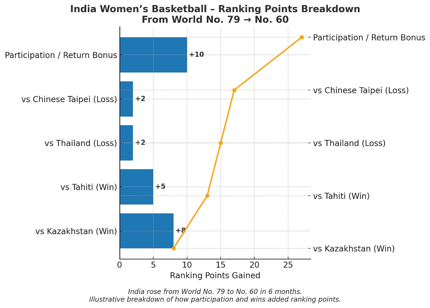 Beyond ‘turning up,’ India also secured wins in Division B. The team beat Kazakhstan 85–68 and Tahiti 78–55 before falling to Thailand in the semifinal qualifiers. Those official games boosted India’s recent history average. Paired with the time decay that downplays older inactivity, it helped produce the +19 jump.