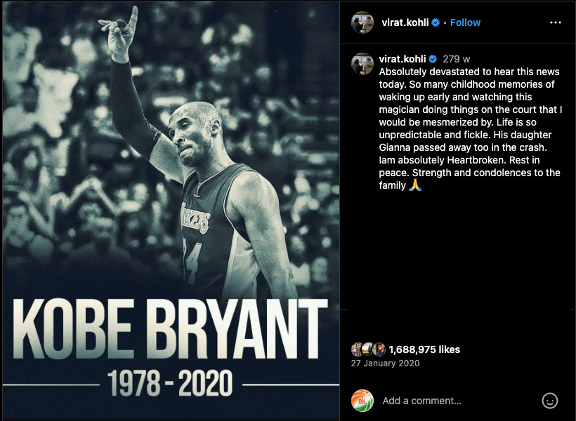 Notably, Kohli appears to be a Kobe fan himself, by his Instagram post after the untimely passing of the Lakers legend seems to suggest: